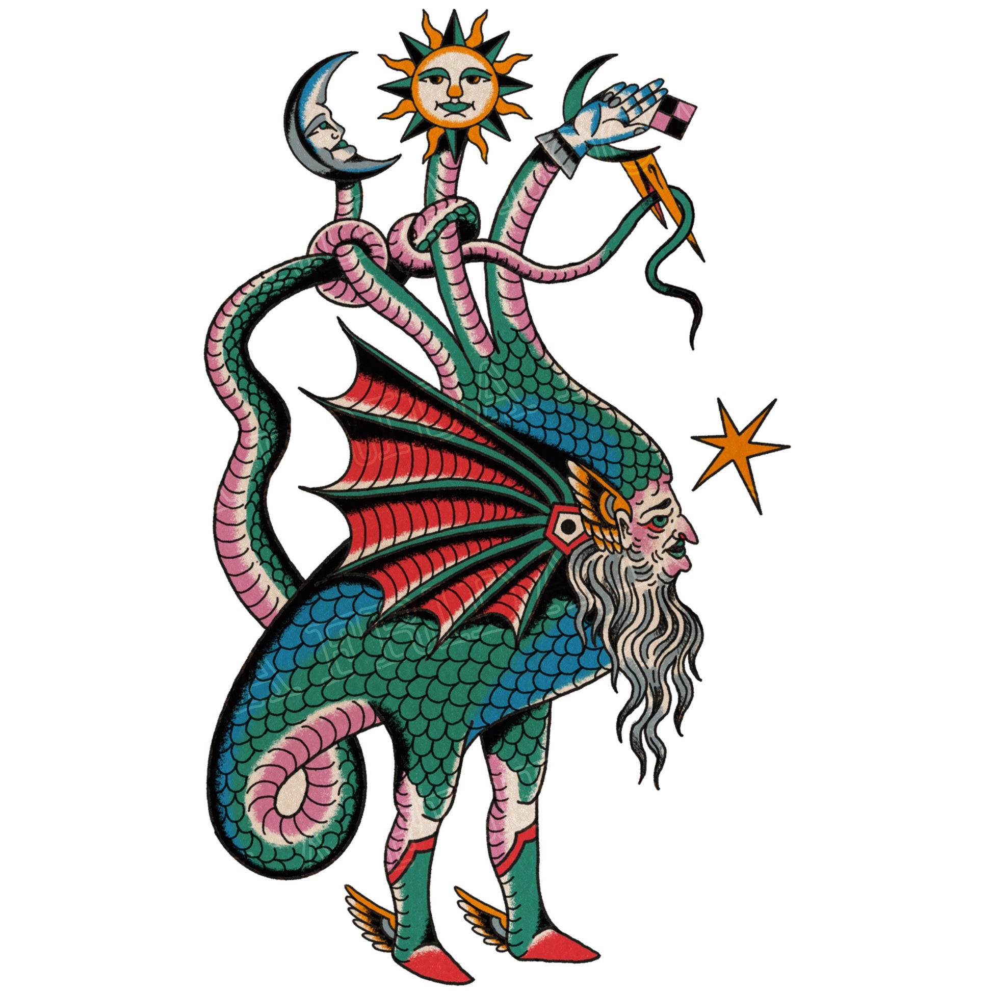 Être archaïque portant le Soleil, la Lune et la Main, incarnation de l’équilibre entre le savoir, l’intuition et l’acte juste. Savoir. Ressentir. Agir.